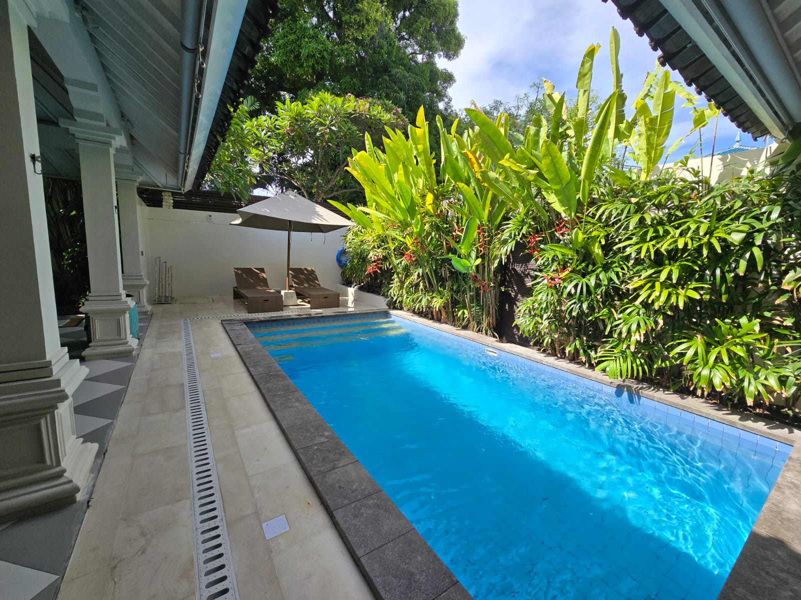 Pool with sun lounges and umbrella